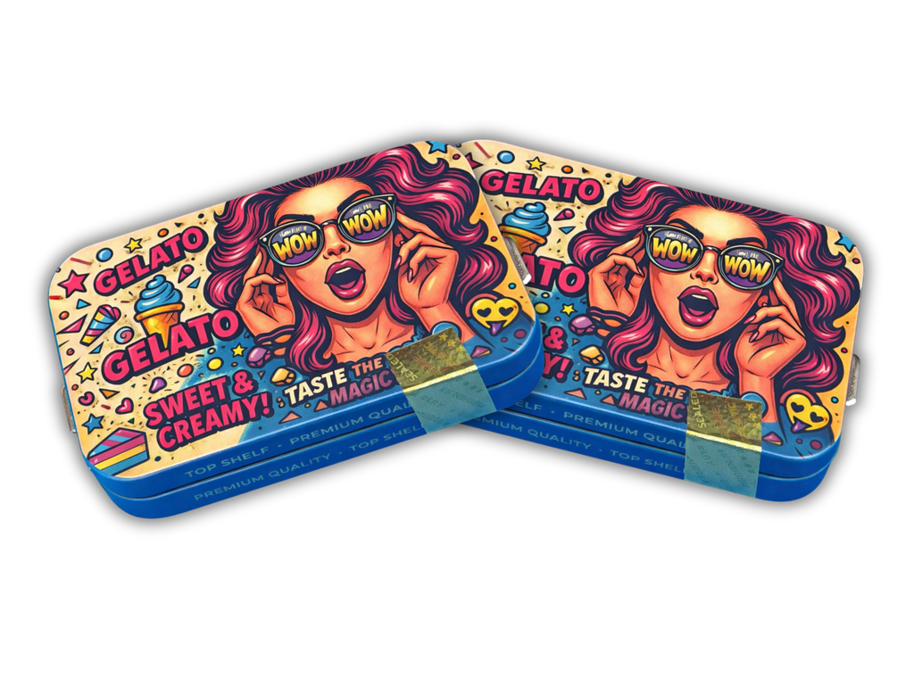 The Gelato Sweet & Creamy Tin Can features colorful, eye-catching artwork inspired by modern candy-style packaging, designed for standout presentation and everyday use. This empty tin can is ideal for storing small items while keeping contents protected and organized.