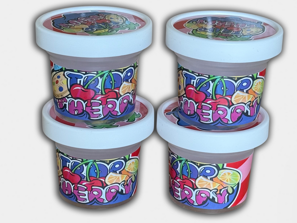 The Trap Cherry 4 Jar Set with Box (3.5g Ice Cream Jar Set) features bold, vibrant artwork inspired by cherry-forward flavors and colorful street-style design. The playful yet polished visuals help this set stand out while maintaining a clean, professional presentation suited for premium displays.